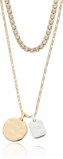 A sparkling tennis chain and two-tone hammered pendants catch the light on this artfully layered necklace that brings instant shine to any look.