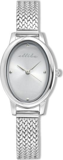 This dainty watch features a sleek oval case paired with a refined mesh strap, offering a timeless silhouette with a contemporary twist.