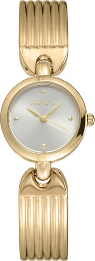Minimalist markers and script branding sit perfectly in the center of the sunray dial on a polished timepiece set on a ribbed bracelet.