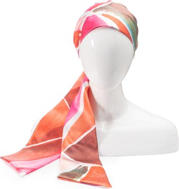 A colorful pattern details this satin head wrap that's perfect for accessorizing and protecting your tresses.