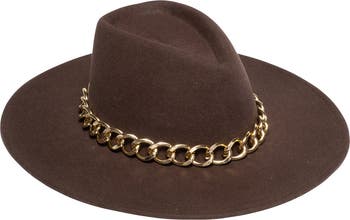 Felted wool elevates a stylish fedora highlighted with a dimpled crown, wide brim and tonal gleaming chain band.