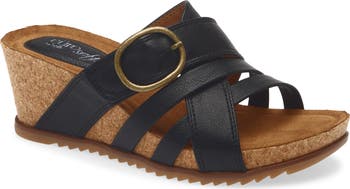 A well-cushioned footbed and comfortable cork wedge heel support your stride in this versatile sandal featuring faux-leather vamp straps and a rustic buckle for a secure fit.