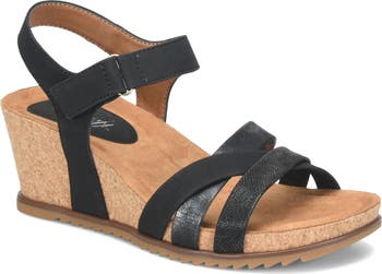 Crisscrossing straps enhance the sunny-day vibe of this comfort-minded sandal featuring a cushioned footbed and cork-wrapped wedge heel.
