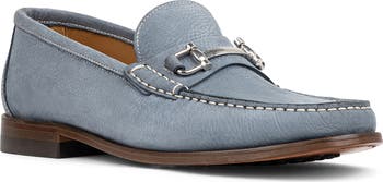 Contrast stitching traces the minimalist silhouette of a clean-lined loafer crafted from Italian nubuck leather with a polished metal bit. Memory-foam cushioning and a pebbled outsole add practical utility to this refined style.