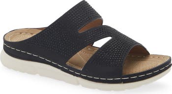 An asymmetric cutout design brings a contemporary update to a weekend-ready slide sandal encrusted with crystals.