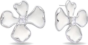 A sparkling emerald-cut crystal centers these flower stud earrings finished with a high polish so they gleam at your lobes.
