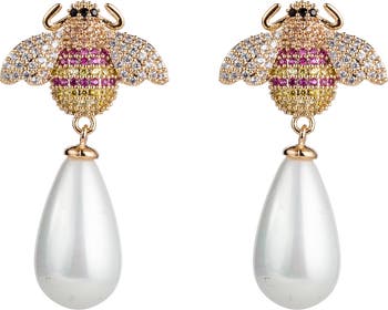 Beautiful imitation pearl drop earrings feature gleaming bee studs covered in sparkling cubic zirconia stones for a glamorous style.
