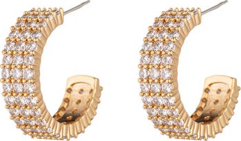 A triple row of pavé cubic zirconia brings sparkling shimmer to these huggie hoop earrings that's rendered from goldtone plate.