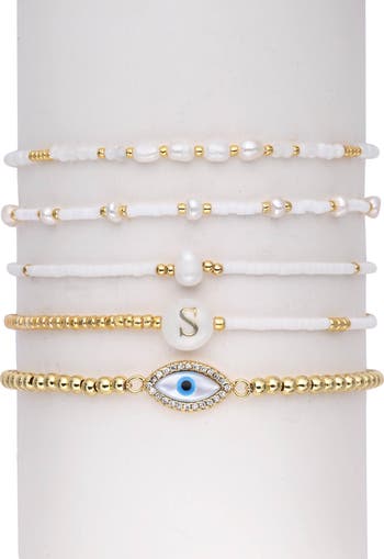 Mix and match your wrist stack with this assorted jewelry set featuring a variety of beaded bracelets detailed with an evil-eye charm, initial accent and more.