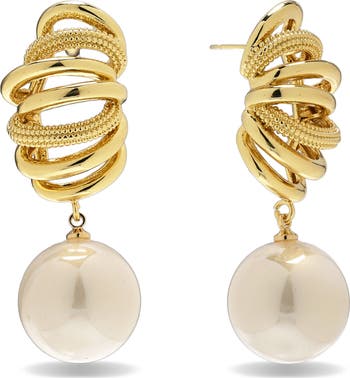 Domed coils catch the light on these sculptural earrings supsending lustrous faux-pearl drops for elegant shine.