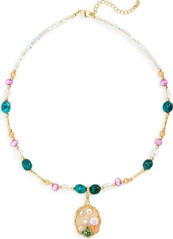Delicate rose motifs accent the vintage-inspired shell-pearl pendant of a romantic statement necklace strung with vibrant beads and shimmery crystals.