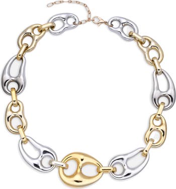 Sculpturally mismatched chain links in a two-tone finish bring striking contrast to this statement-making necklace designed to fit closely against the throat.