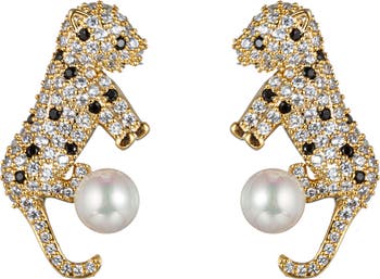 Pavé black-and-white leopards stand on top of luminous faux pearls in these studs that's rendered in warm goldtone plate.