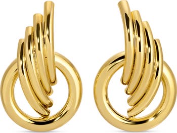 A rich texture and geometric shapes draw the eye to these statement-making studs that are gleaming in goldtone plate.