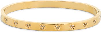 Heart-shaped indentations are shimmering with cubic-zirconia stones on this slender bangle bracelet that instantly sweetens your wrist stack.