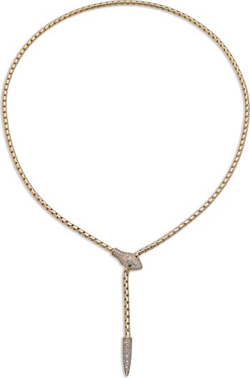 A gleaming popcorn chain slinks around and down your neck to shape this lariat highlighted with a sparkly serpent.