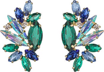 Faceted crystals bring a pop of color to statement-making earrings that elevate any outfit.