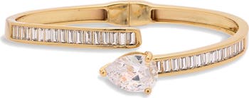Twinkling baguette-cut cubic zirconia ring this hinged cuff bracelet finished with a larger arrow-shaped cubic zirconia stone at the closure.