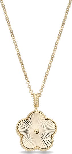 Dainty beads trim the flower-shaped pendant of a shiny goldtone plate chain necklace.