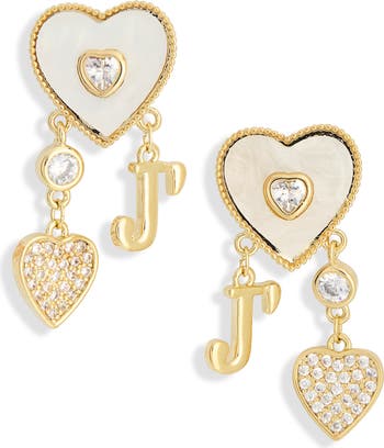 Personalize your look with these J-initial drop earrings illuminated by sparkly crystals and polished hearts for romantic shine.