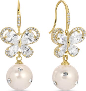 Sparkling butterflies and cubic zirconia–embellished imitation pearls enrich stunning drop earrings finished in gleaming goldtone plate.