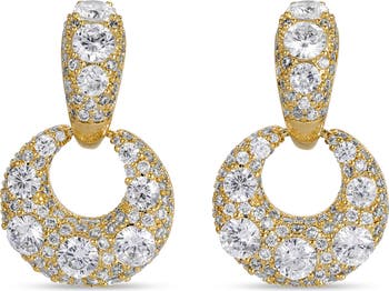 Varying sizes of round-cut cubic zirconia stones bring sparkle to these double hooped drops that's rendered in warm goldtone plate.