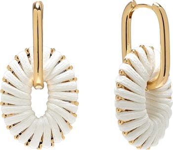 Polished oval huggies suspend raffia-wrapped drops in these earrings plated in warm goldtone.
