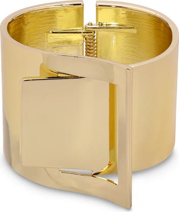 Bright polish and warm goldtone plating define a cuff bracelet with clean lines for geometric appeal.