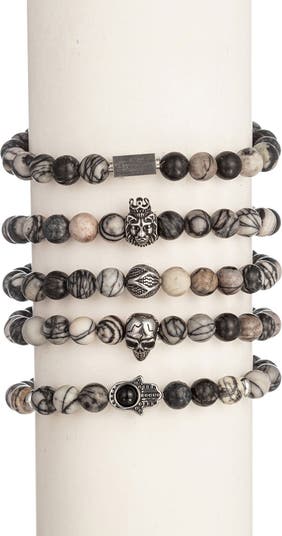 Polished stone beads are swirled with marbled veins for unique finish on each stone. A mix of rustic charms complete this bold set of bracelets.