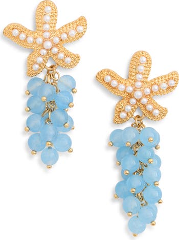 Lustrous faux pearls outlines the starfish studs of these drop earrings suspending bunches of aqua baubles.