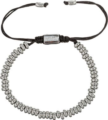 High-shine titanium beads line this adjustable slider bracelet that's finished with an etched logo tag bead.