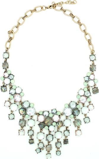 - Gold-tone prong set multicolor enamel rhinestone draped bib necklace - Lobster clasp - Approx. 17.5" chain length with 2" extension - Approx. 9.5" L x 1.5-3" W bib - Imported