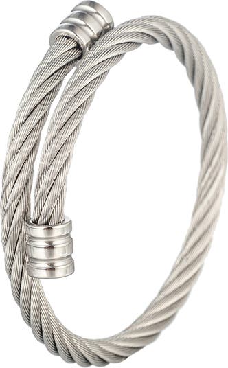 Twisted cable coils simply to complete this industrial-inspired bracelet easy for everyday styling.