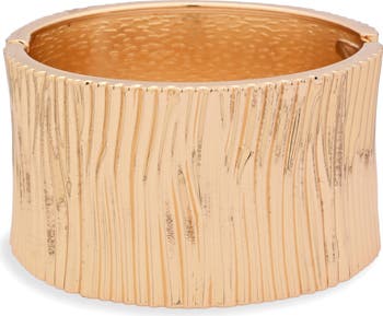 Glam up your look with this hinged cuff bracelet textured by woodgrain-inspired ridges for stunning shine.