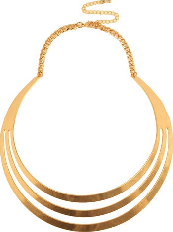 Orbiting ring cutouts with a high-polish shine compose this statement collar necklace for chic style.