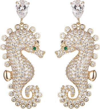 Sparkling pear cut CZ stones suspend pavé CZ embellished seahorse drops for chic, beach-inspired style.