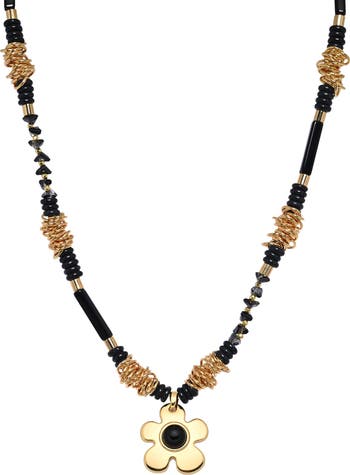 Make a groovy statement in this necklace strung with inky beads, coiled accents and a polished daisy pendant.