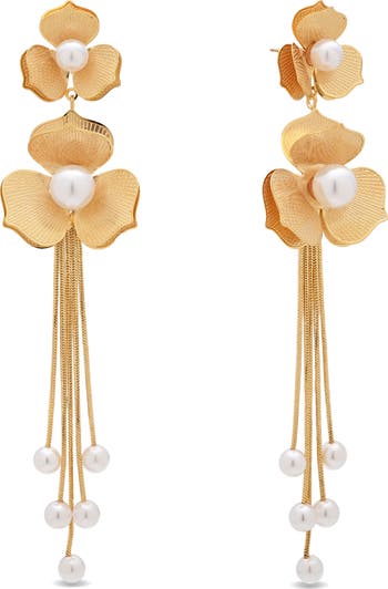 Imitation pearls center the flowers and tip the fringe of pretty statement earrings.
