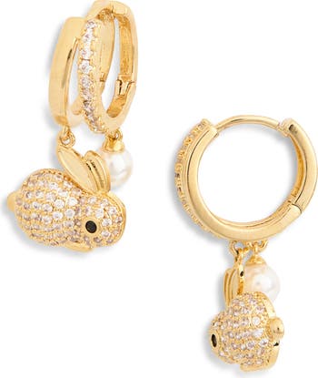 Add a cutesy and whimsical style as a finishing touch to your everyday ensembles with these double-huggie hoops suspending pavé bunny charms and lustrous faux pearls.