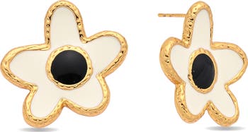 Goldtone metal frames sketched-silhouette flowers on statement stud earrings.