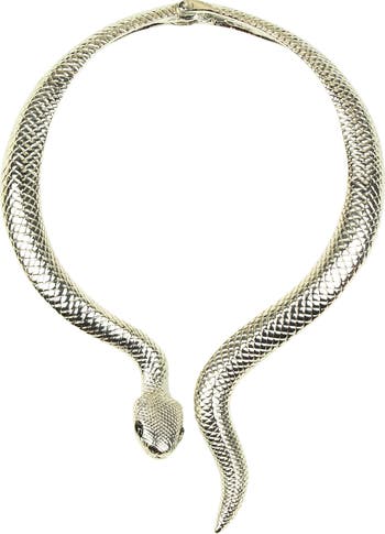 A snake shaped choker necklace adds sultry attitude to your night out looks.