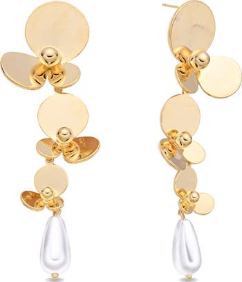 Teardrop-shaped imitation pearl pendants anchor delicate drop earrings abloom with flowers.