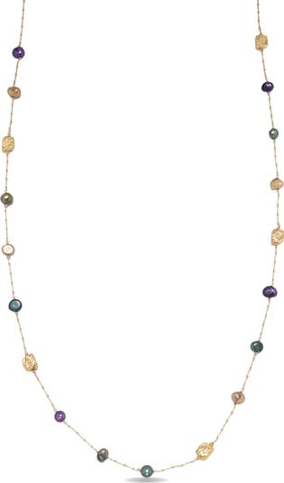 Refresh your jewelry collection with this ultralong station necklace showcasing hammered beads and lustrous freshwater pearls in different hues.
