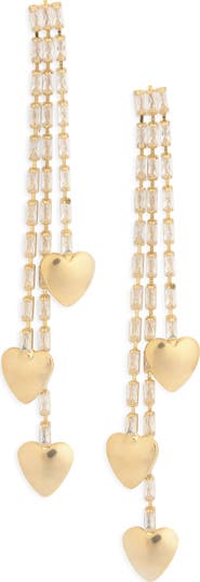 A trio of hearts accents the ends of these cubic zirconia drop earrings made from polished goldtone plate.