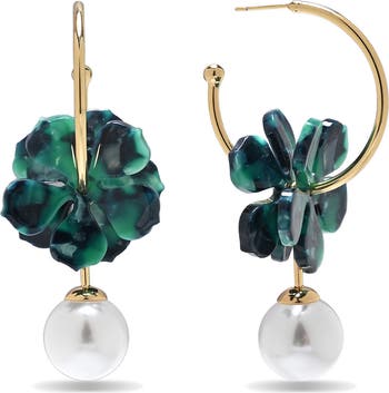 Glossy acrylic flowers frame lustrous faux-pearl drops on these bold hoop earrings that bring tropical flair to your look.