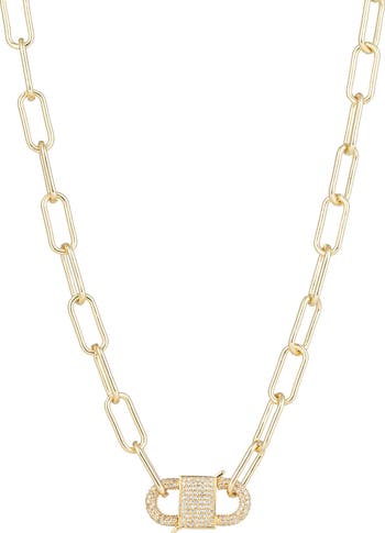 A gold-tone chain link necklace features a cubic zirconia encrusted pendant.