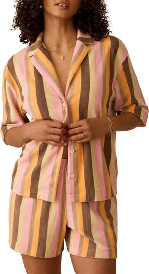 Chase the sun in this soft terry camp shirt made from soft organic cotton and covered in retro stripes.