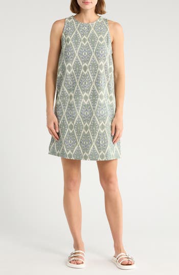 A hand-dyed ikat pattern adds dreamy dimension to a sleeveless shift minidress woven in soft-yet-substantial organic cotton.
