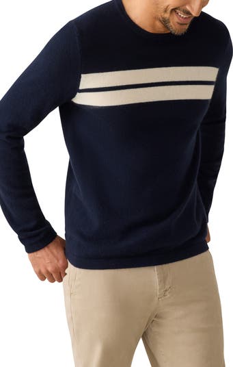 Enjoy the luxurious softness and lightweight warmth of this striped crewneck sweater knit from cozy cashmere yarns.