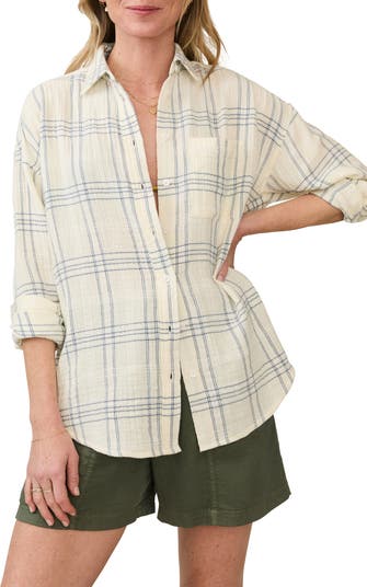 You'll be cool and comfortable no matter what the weather's doing, in this breezy button-up shirt made from soft organic cotton gauze in a low-key plaid pattern.